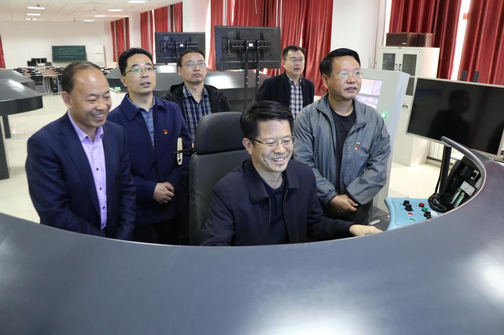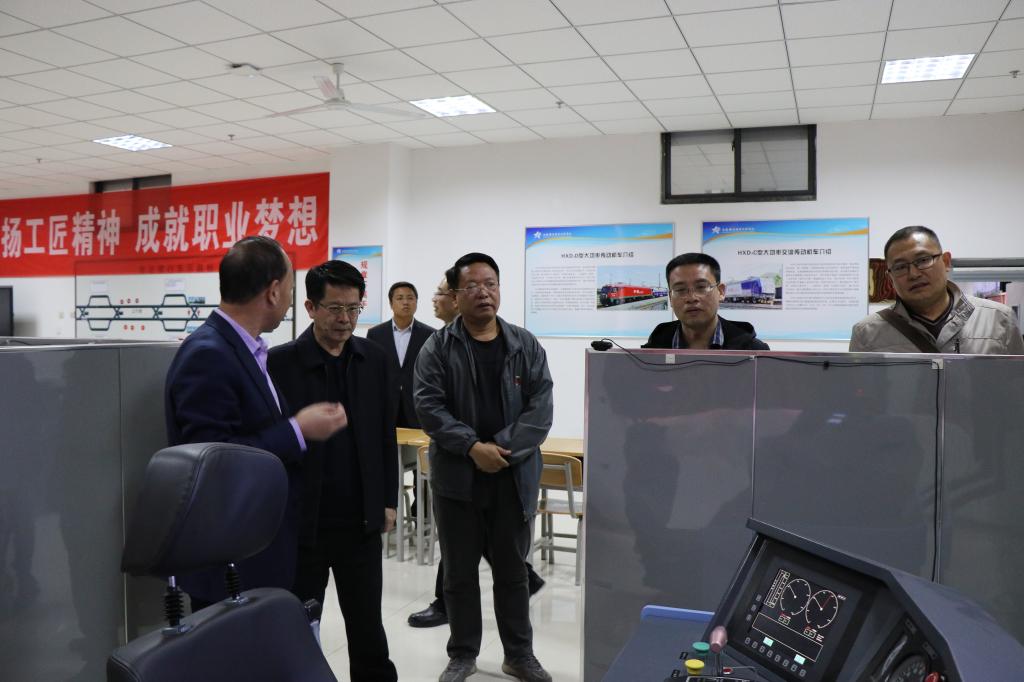 在李益民带领下,山东职业学院一行分别参观了牵引动力学院实训中心的HXD3型机车模拟驾驶实训室、SS4B和SS8型机车模拟驾驶实训室、机车车钩自检自修实训室、DK-1型电空制动机实训室、城轨车门实训室、磁粉探伤实训室、CCB-II型电空制动机实训室、机车乘务员一次乘务作业实训室、CRH380AL动车组模拟驾驶实训室和城轨车辆模拟驾驶实训室等,秦河院长体验了的CRH380AL动车组模拟驾驶,双方还就党的建设、学生招生就业、生产性实验实训室建设及布局设计等方面进行了交流。