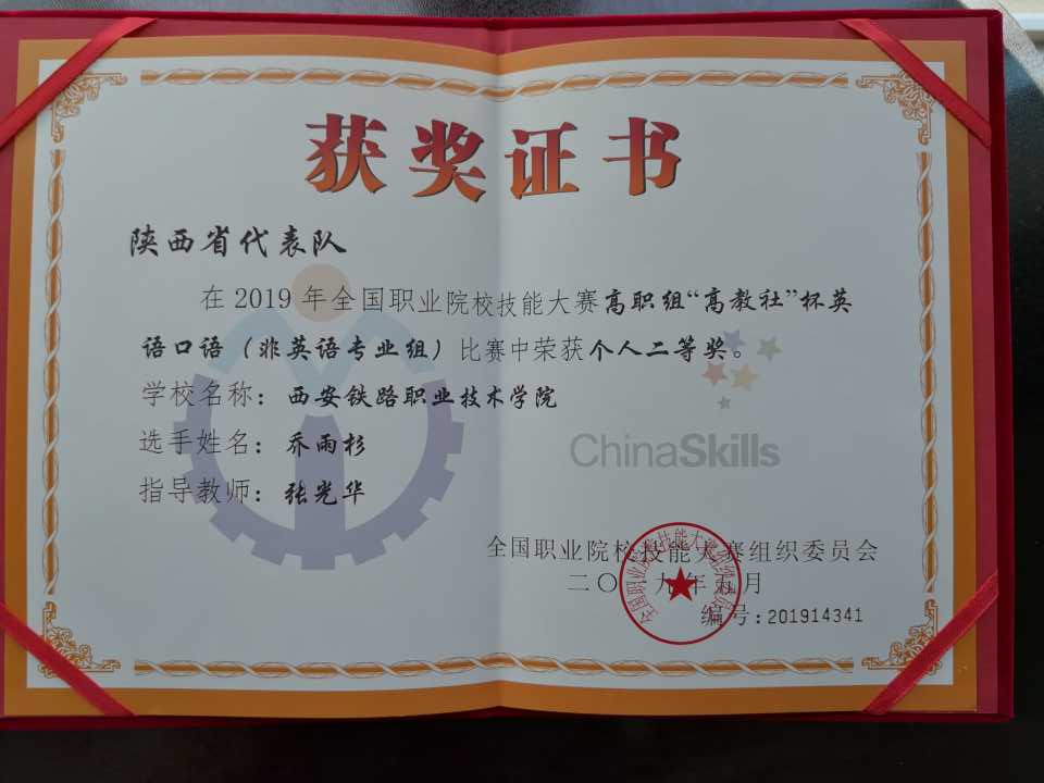 5月29日-31日,由教育部、国家发展和改革委员会等36家有关部委、省市和协会主办,山东省教育厅、青岛市人民政府等5家单位协办的2019年全国职业院校技能大赛高职组“高教社”杯英语口语赛项在山东外贸职业学院成功举行,鸭脖土木工程学院摄影测量与遥感技术1801班学生乔雨杉以优异的表现获得非英语专业组二等奖的好成绩,这也是鸭脖和陕西省代表队在该赛项上的一次全新的突破。