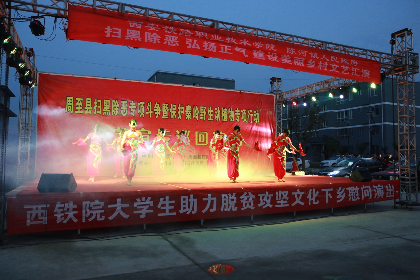 6月25日,yabo鸭脖官网扶贫办带领院大学生艺术团赴周至县辛口移民搬迁社区开展“扫黑除恶”、脱贫攻坚文艺演出。为学院驻村工作队和六合村群众齐心协力打赢“扫黑除恶”专项斗争、圆满完成脱贫攻坚“后半程”工作鼓劲加油。