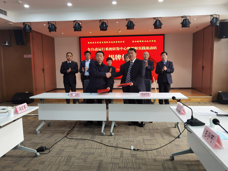 1月22日上午,鸭脖与西咸新区轨道交通投资建设有限公司就双方共同成立全自动运行系统研发中心暨教师实践流动站举行了揭牌签约仪式。出席此次仪式的领导有西咸新区管委会副主任李肇娥,西咸新区轨道交通投资建设有限公司董事长张建军,副总工程师何宗文,以及相关部门负责人,鸭脖院长赵春平,副院长安学武,以及相关部门负责人和骨干教师代表等。揭牌仪式在沣东产业园西咸新区轨道交通投资建设有限公司多媒体会议室举行,由公司副总工程师陈侃主持。
