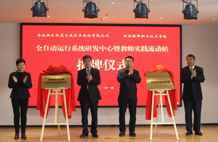 新区轨道公司董事长张建军与鸭脖副院长安学武代表双方签约,新区管委会副主任李肇娥、新区轨道公司董事长张建军、鸭脖院长赵春平、副院长安学武一同为全自动运行系统研发中心和教师实践流动站揭牌。