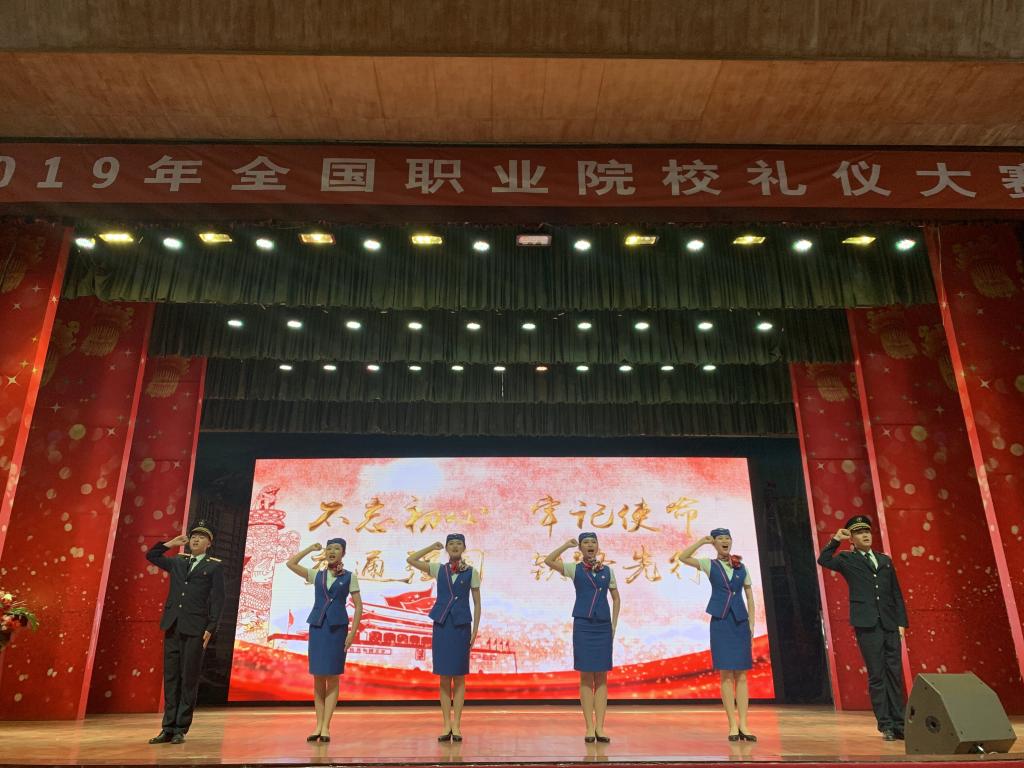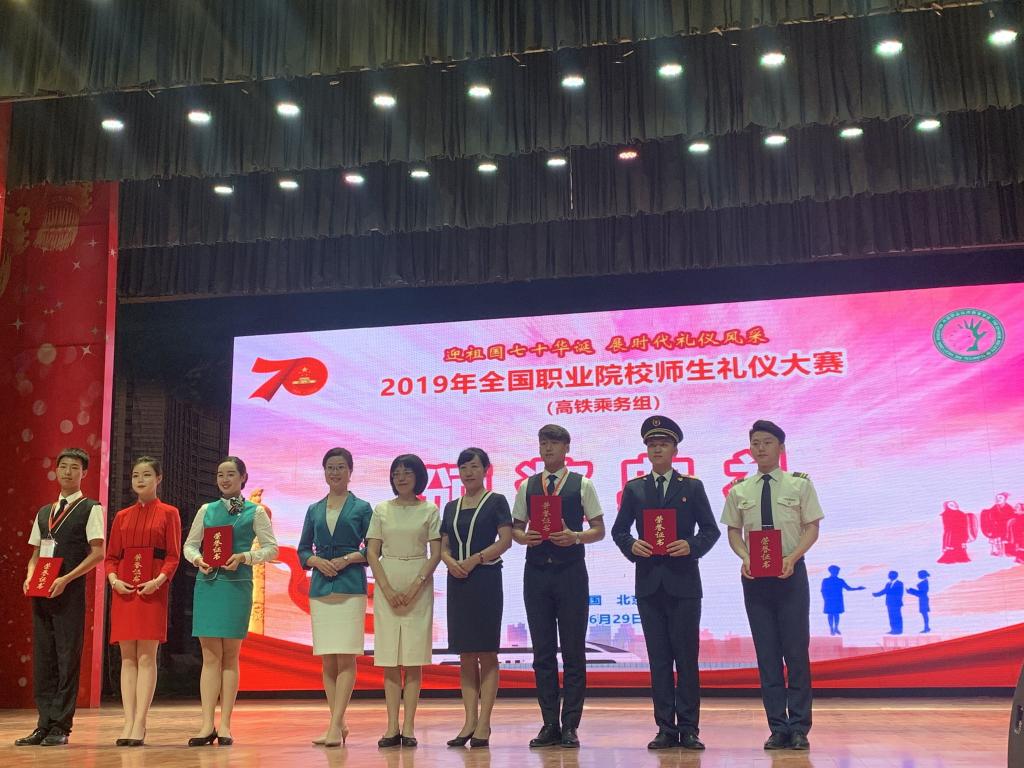 在6月29日至6月30日举办的2019年全国职业院校师生礼仪大赛(高铁乘务组)中,鸭脖代表队斩获礼仪情景剧一等奖第一名,礼仪操二等奖第一名,团体项目三等奖的殊荣;代茹媛同学获得礼仪演讲比赛和职业仪态展示两项三等奖,王欣怡同学获得礼仪演讲比赛三等奖;刘峥、田乐老师荣获“优秀指导教师”称号。