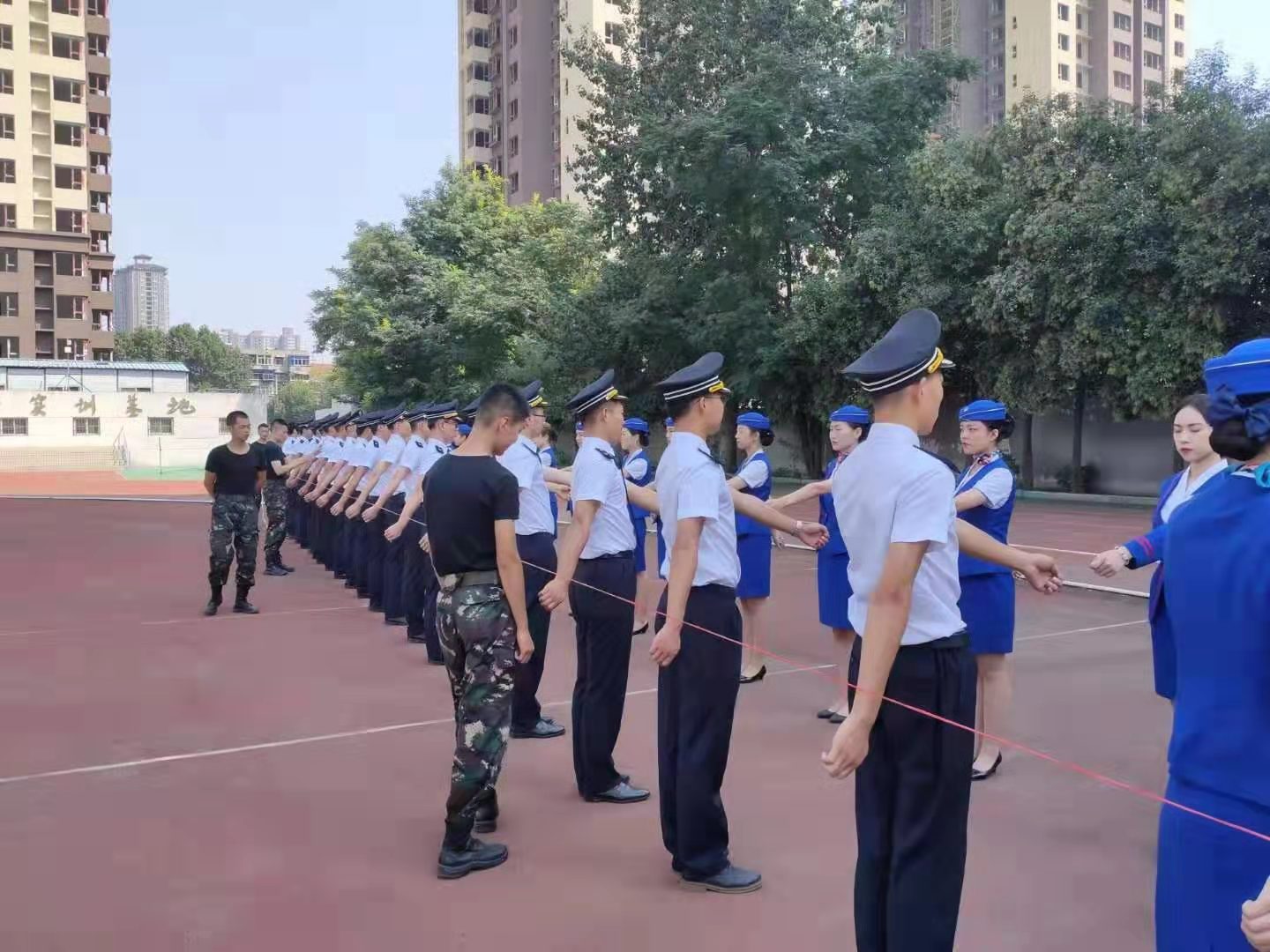 自8月底收到西安局集团公司的观摩邀请后,学院领导高度重视,安排院团委与交通运输学院共同做好竞赛决赛开幕式观摩成员的选拔与培训工作。8月29日,院团委与交通运输学院召开协调会,组织学院国旗护卫队与高铁乘务专业的学生提前返校,择优确定了男女各20名学生组成观摩团,并于当天开始在走姿、动作、仪容仪表等方面开始训练。训练期间,同学们每天训练长达8小时,国旗护卫队的同学们每天6点起床,乘坐第一班地铁从港务校区赶往自强校区为观摩团指导训练。