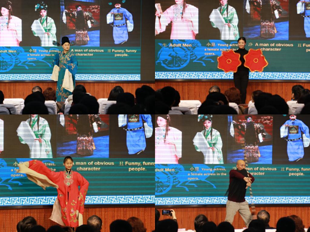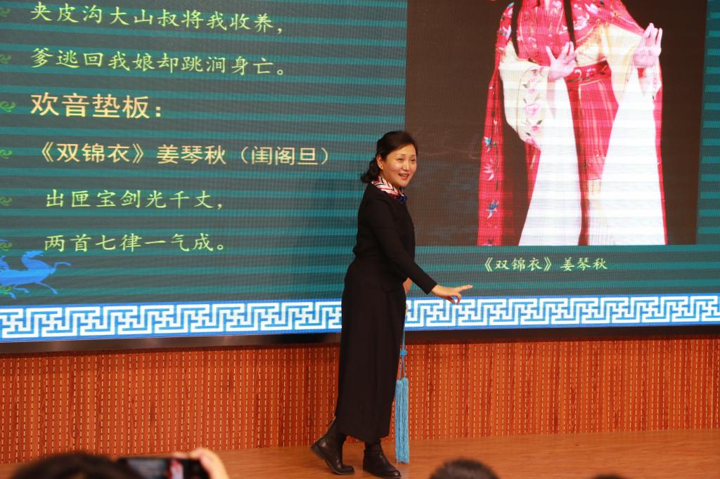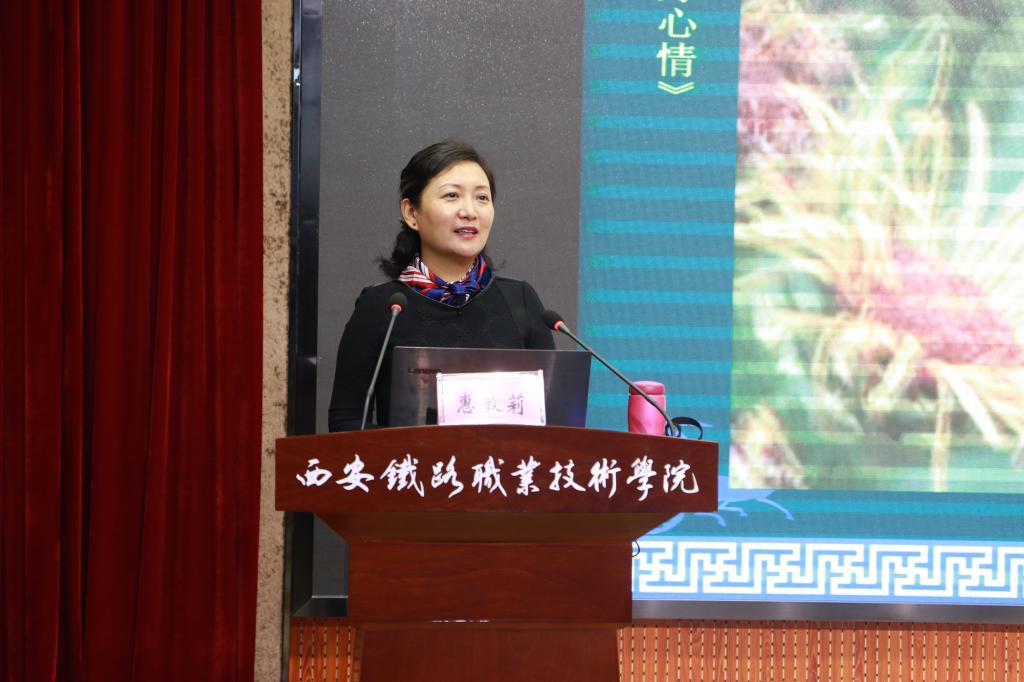 报告会上,惠敏莉从秦腔的起源谈起,从创社者的民族担当讲到继承者的创新发展,为现场200多名师生详细讲解了秦腔和易俗社的基本历史和现状、秦腔的编演种类、声腔特点、唱词、板式等内容,惠老师躬身范唱经典选段、传承班学员上台展示四功五法,哀婉的板胡,轻快的扬琴以及婉转的唱腔似穿越时光的隧道,现场掌声阵阵、气氛活跃。随后,她结合自身学戏经历,对青年学子提出了殷殷期望,她希望在座的新时代铁路学子能始终不忘初心,业精于勤,积极了解和弘扬中国传统文化,夯实知识,努力成长为轨道交通行业全面发展的高素质技能型人才。最后,惠老师与传承班学员共同为大家展示了传统秦腔艺术中的声腔、服饰、道具之美,学生在易俗社四位学员的指导下上台置换戏装,亲身体验了秦腔魅力,大家纷纷表示回味无穷。最后,全体师生与西安易俗社全体学员上台合影留念。