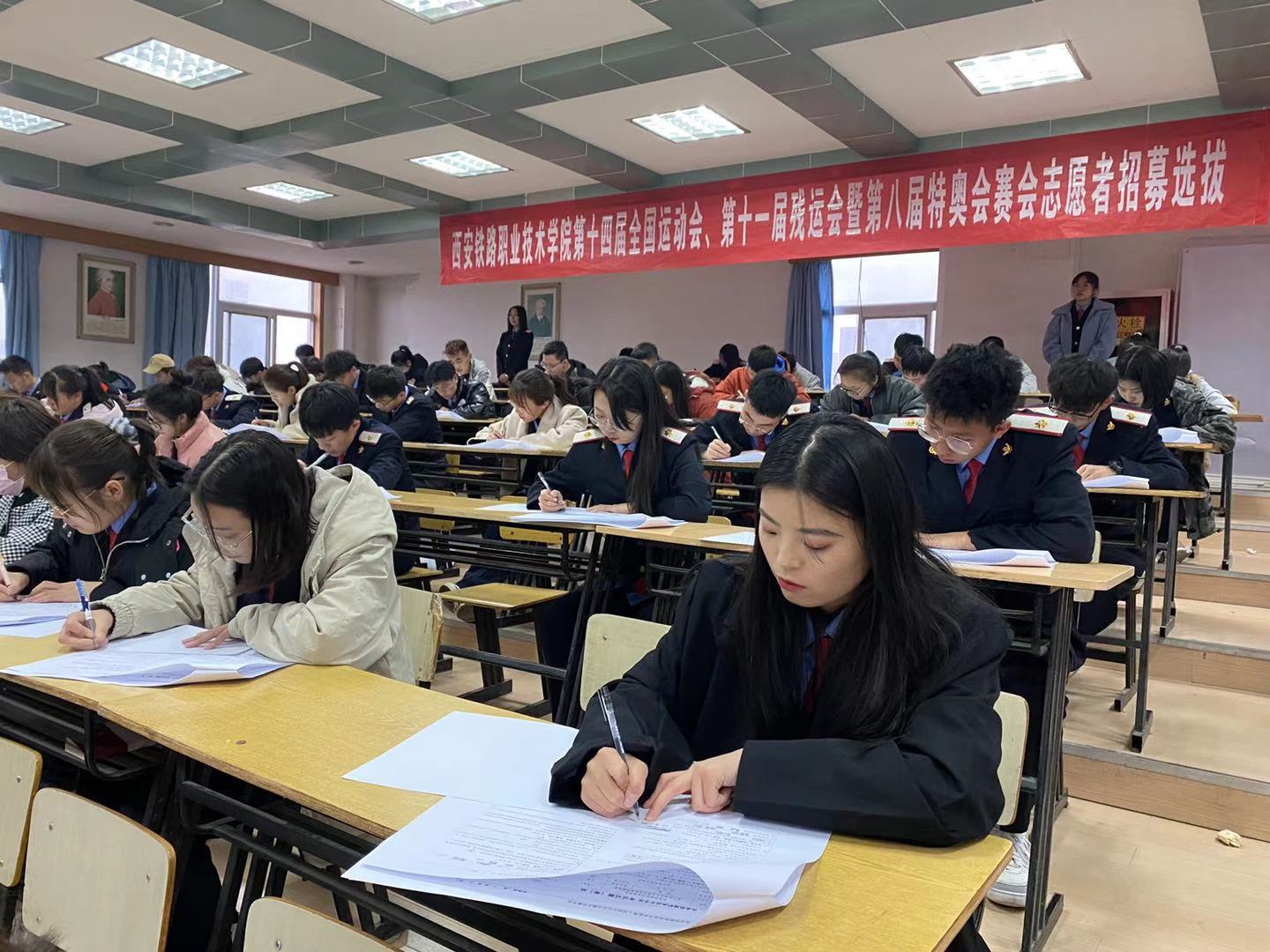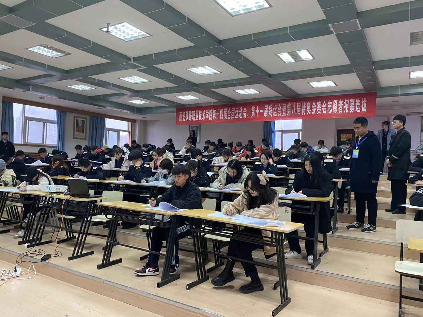按照赛事筹委会志愿者服务部的工作安排部署,鸭脖赛会志愿者名额分配计划共计40人,主要负责大赛期间西安北客站的接待服务,考虑就近就便原则与赛会时间,院团委在交通运输学院与电子信息学院的大一学生中进行了志愿者招募工作。鸭脖前期报名人数为568人,交通运输学院、电子信息学院分别进行了初选环节,二级学院团总支以总名额1:2的比例将初选名单报送院团委,再由院团委审核后组织笔试和面试环节(笔试成绩占40% ,面试成绩占60%),最终筛选出1:1.2志愿者(共48名)上报西安市执委会审核,并注册进入十四运会和残特奥会志愿者管理服务系统参加学习,根据学习考核成绩,最终确定40名志愿者。之后若有工作需要,院团委将按照上级团组织和学院党委工作安排,从全院再次进行志愿者招募选拔工作。面试环节中,院团委副书记李妮,团委办公室副主任田辰、交通运输学院与电子信息学院辅导员代表作为面试考官,团委选派主要学生干部负责考场考务工作。招募工作严格规范有序开展。