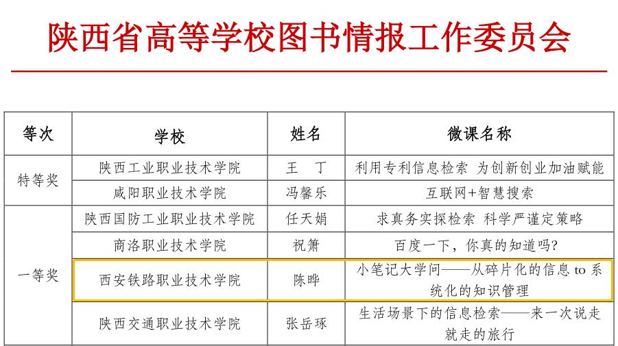 在教师微课赛中,全省14所高职高专院校共提交的38件参赛作品,根据省赛规则,经行业专家评审及组委会研议,共评选出23件获奖作品,鸭脖图书馆老师陈晔荣获一等奖。