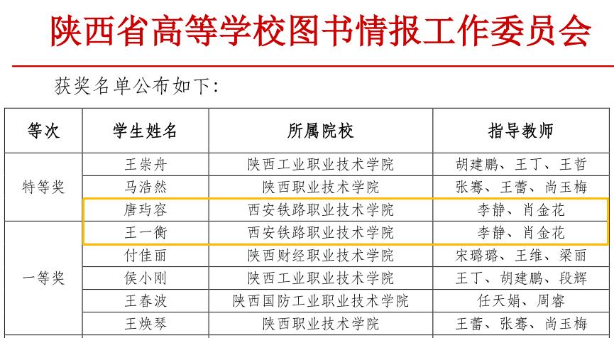 由陕西省高等学校图书情报工作委员会主办,陕西省高校图工委高职高专工作组承办,北京万方数据股份有限公司和北京方正阿帕比技术有限公司协办的2020年全国高职高专院校信息素养大赛陕西赛区比赛在咸阳职业技术学院圆满落幕,鸭脖师生在学生个人赛与教师微课赛中喜获佳绩。同时鸭脖荣获“优秀组织奖”。