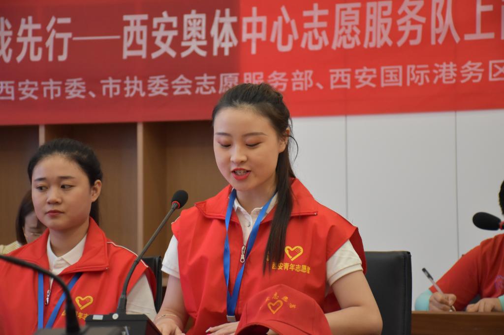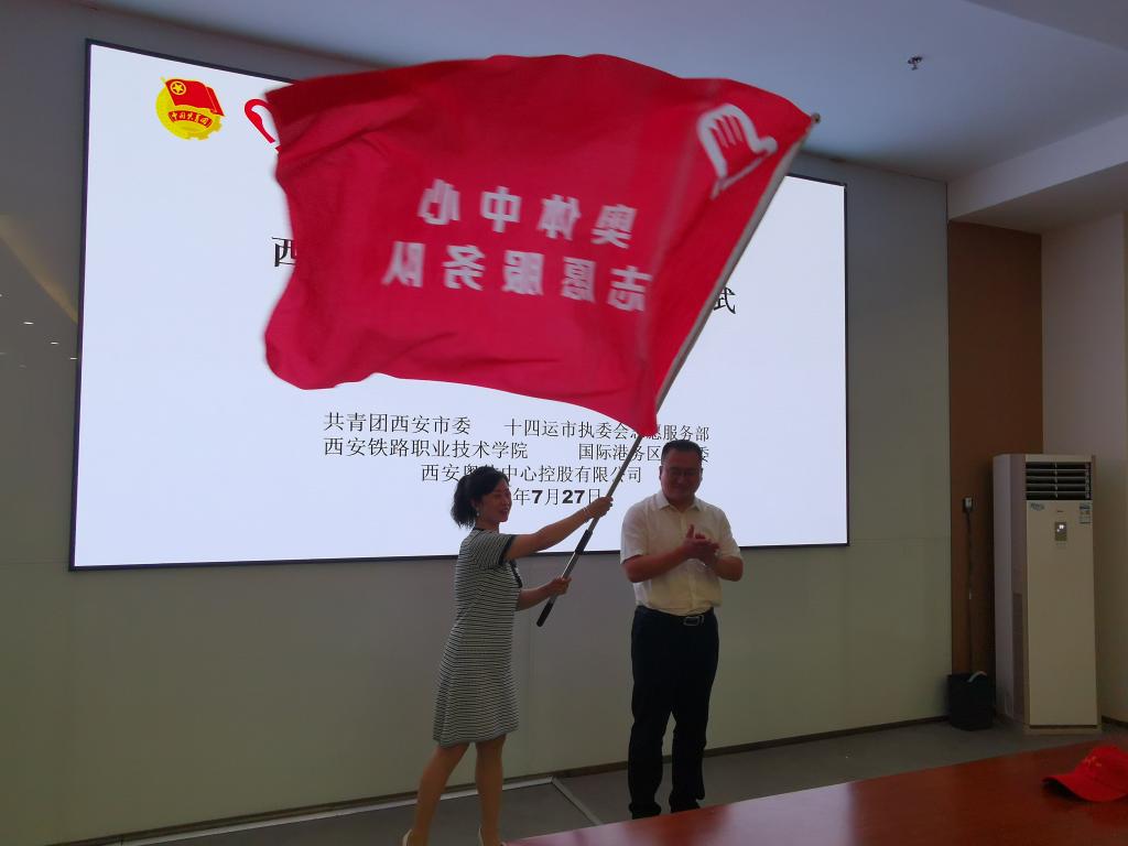 7月27日,由团市委、十四运西安市执委会志愿服务部联合鸭脖共同成立的首支西安奥体中心志愿服务队上岗仪式在西安奥体中心举行。团市委副书记、十四运西安市执委会志愿服务部驻会副部长徐辉、华润置地西安体育会展平台公司常务副总经理周晓明、西安国际港务区组织人事局局长韩婷婷、鸭脖团委副书记李妮与鸭脖15名志愿者参加上岗仪式。