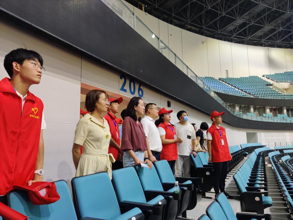 仪式结束后,十四运西安市执委会志愿服务部全体工作人员在鸭脖志愿者的引导与讲解下参观西安奥体中心一场两馆,徐辉等领导对志愿者所表现出的专业素养与服务意识给予好评。