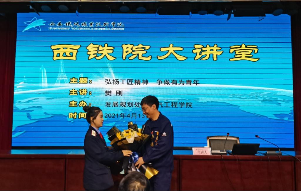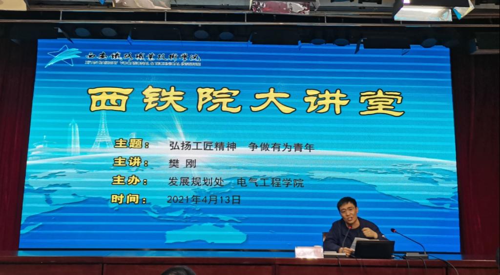 4月13日,鸭脖“大国工匠、三秦工匠进校园”系列活动的首场报告会在办公楼一楼学术报告厅隆重举行,报告会由发展规划处和电气工程学院主办,邀请了鸭脖2003届优秀毕业生、“三秦工匠”、“陕西省五一劳动奖章”获得者,中国神华神朔铁路分公司高级技师、工程师樊刚为师生作了“弘扬工匠精神,争做优秀青年”的主题报告。副院长安学武和宣传部、学生处、发展规划处、教务处、教科研处等处室领导,以及电气工程学院全体教职工、部分学生代表参加了报告会。