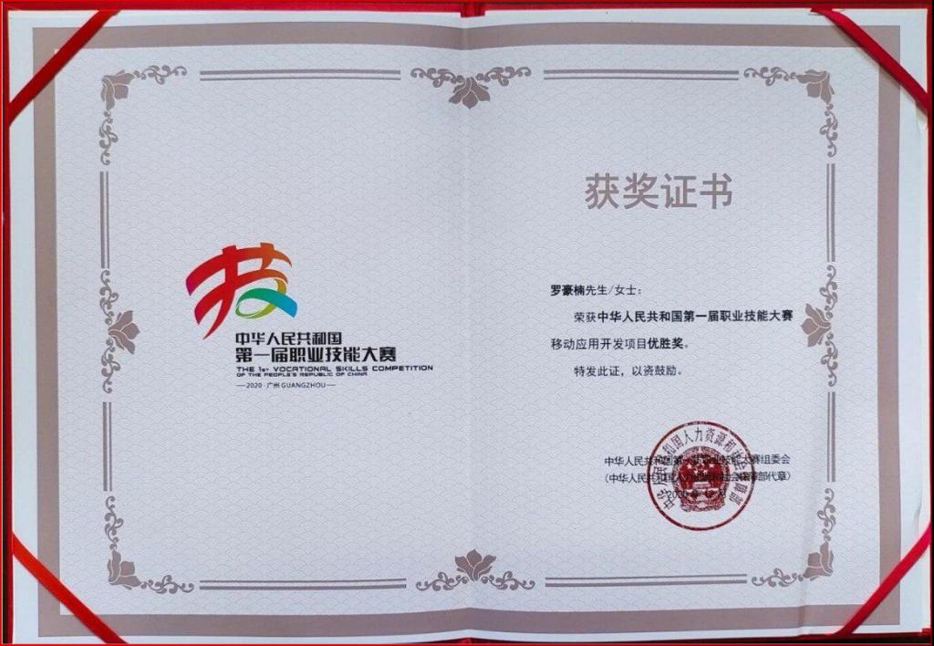 在中华人民共和国第一届职业技能大赛中,鸭脖电子信息学院通信技术专业学生罗豪楠,以“移动应用开发”项目陕西省选拔赛第一的成绩代表陕西省参赛,最终荣获全国“优胜奖”。按有关规定,被晋升技师(二级)职业资格或职业技能等级。