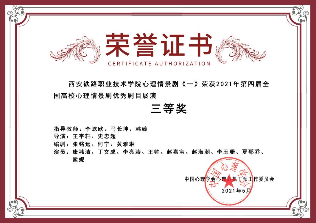 近日,第四届全国高校心理情景剧大赛现场决赛及颁奖仪式在广西大学举行,学院临潼校区选送的心理剧作品《一》荣获本届比赛三等奖,是陕西省入围五所高校中唯一的高职院校。
