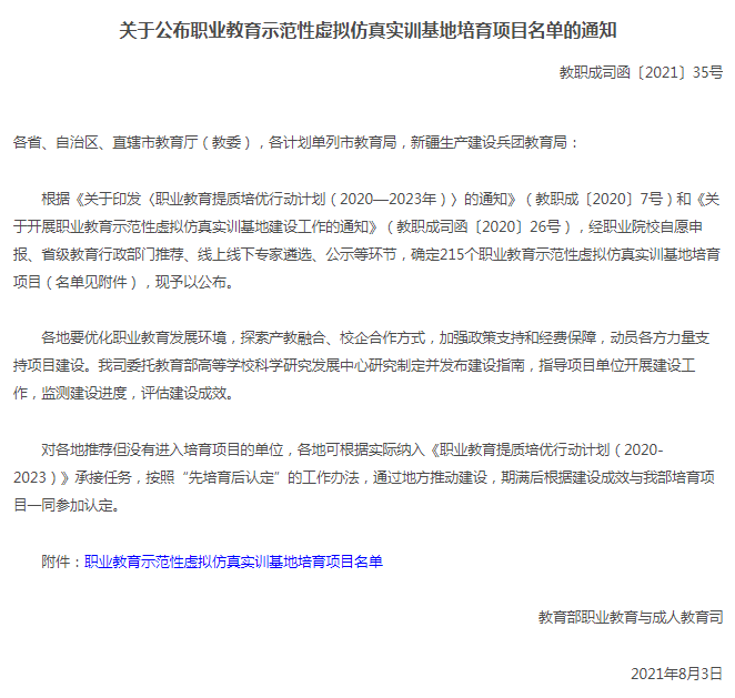 日前,根据教育部《关于公布职业教育示范性虚拟仿真实训基地培育项目名单的通知》(教职成司函〔2021〕35号),鸭脖“轨道列车智能运行与维护系统虚拟仿真综合实训基地”被教育部正式确定为职业教育示范性虚拟仿真实训基地培育项目。