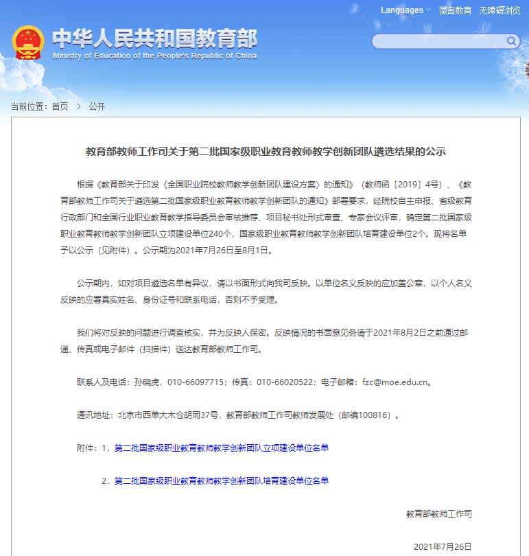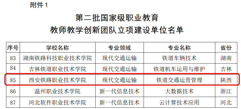 7月26日,教育部教师工作司就“第二批国家级职业教育教师教学创新团队遴选结果”进行公示。根据《教育部关于印发〈全国职业院校教师教学创新团队建设方案〉的通知》(教师函〔2019〕4号)、《教育部教师工作司关于遴选第二批国家级职业教育教师教学创新团队的通知》部署要求,经院校自主申报、省级教育行政部门和全国行业职业教育教学指导委员会审核推荐、项目秘书处形式审查、专家会议评审,鸭脖交通运输学院申报的铁道交通运营管理专业教学团队成功入选第二批国家级职业教育教师教学创新团队立项建设单位。