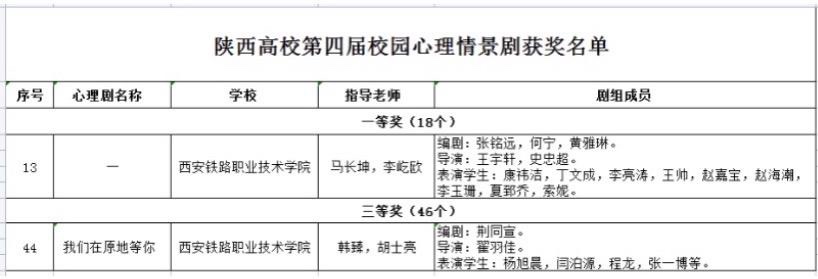 经过省委教育工委组织专家评审,学院在陕西高校第四届校园心理情景剧评选活动中,选送的临潼校区心理情景剧《一》荣获一等奖,指导老师为马长坤,李屹欧;推选的电子信息学院心理情景剧《我们在原地等你》荣获三等奖,指导老师为韩臻,胡士亮。