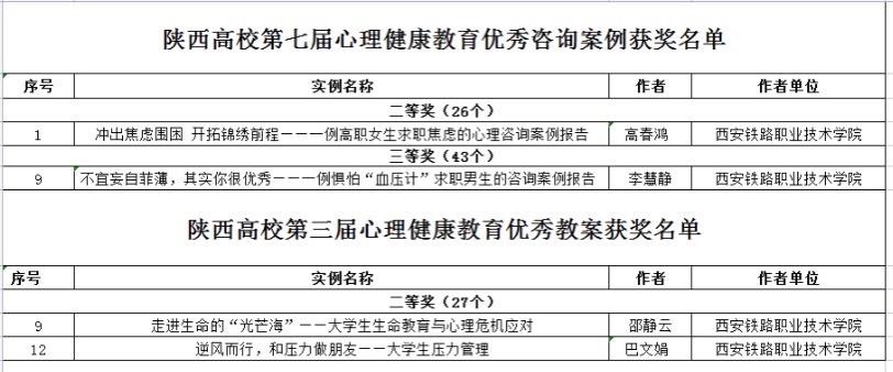 在陕西高校第七届心理健康教育优秀咨询案例推选活动中,学院选送的电气工程学院教师高春鸿的《冲出焦虑围困 开拓锦绣前程——一例高职女生求职焦虑的心理咨询案例报告》荣获二等奖;马克思主义学院教师李慧静的《不宜妄自菲薄,其实你很优秀——一例惧怕“血压计”求职男生的咨询案例报告》荣获三等奖。