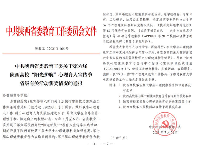 经过精心培育、认真备战,学院选送的6部教师和学生心理育人作品在陕西省委教育工委举办的第六届陕西高校“阳光护航”心理育人宣传季省级活动中全部获奖。其中一等奖1项,二等奖3项,三等奖2项。