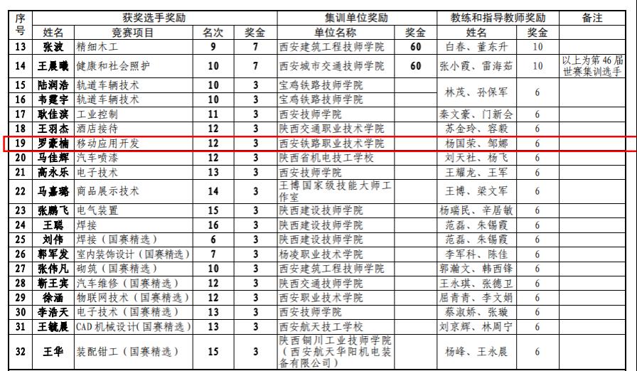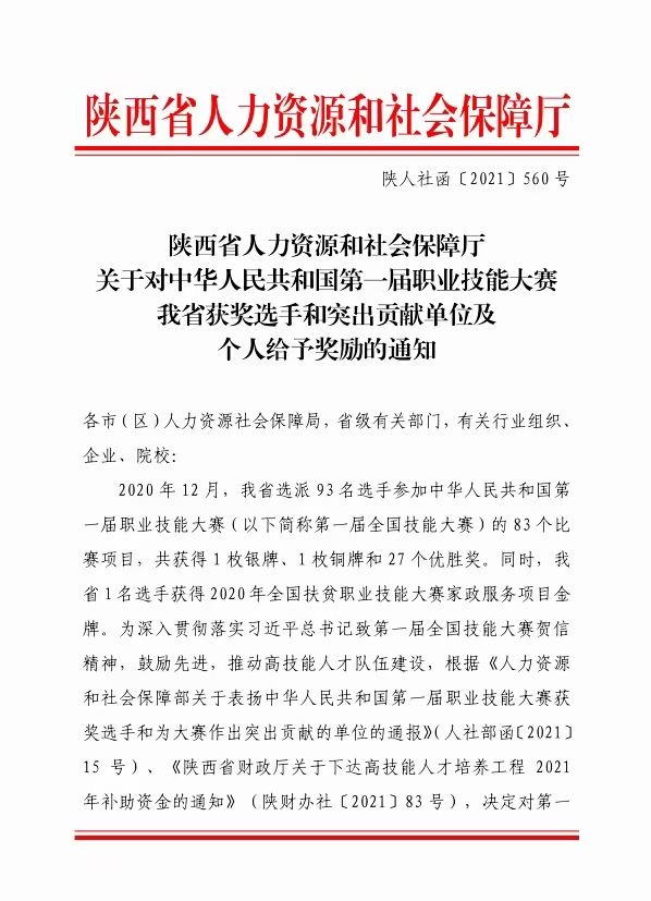 近日,陕西省人力资源和社会保障厅下发《关于对中华人民共和国第一届职业技能大赛我省获奖选手和突出贡献单位及个人给予奖励的通知》,鸭脖2019级学生罗浩楠代表陕西省参加中华人民共和国第一届职业技能大赛“移动应用开发”赛项并荣获优胜奖,作为在校生晋升技师(二级)职业资格;同时,学校荣获突出贡献单位。