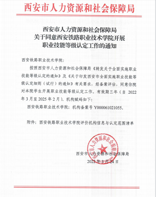 学院职业技能等级认定评价机构备案工作从2021年下半年启动至今,期间克服疫情封校影响,按进度圆满完成了前期各项准备工作,并经2月25日西安市人力资源和社会保障局专家组来校实地考核、评估,最终鸭脖评价机构备案申请获得通过,西安市人力资源和社会保障局同意鸭脖对本院学生开展轨道交通调度员等15个工种、初中高等级的职业技能等级认定工作。