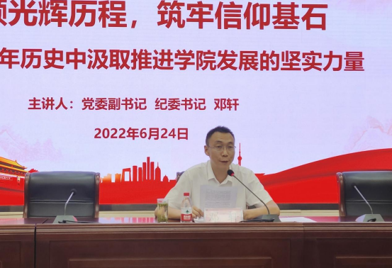 6月24日下午,学院党委副书记、纪委书记邓轩在自强校区为电子信息学生师生讲授了一堂题为“回顾光辉历程,筑牢信仰基石——从党的百年历史中汲取推进学院发展的坚实力量”的党课,电子信息学院教师党员和学生代表60余人现场聆听。