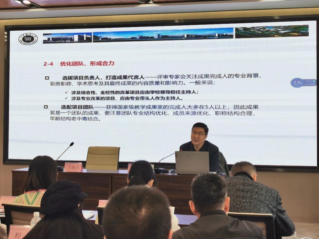 董刚以职业教育教学成果奖的培育和申报为主题,从教学成果奖的培育、往届教学成果奖的回顾与分析、教学成果奖的申报及注意问题三个方面,通过丰富的获奖案例进行了形象、生动的讲解。