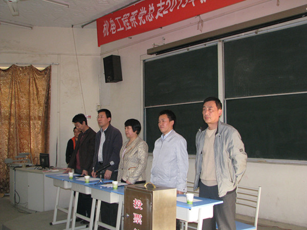 大会在庄严的国歌声中拉开序幕,系主任代礼前首先宣读了《学院党委同意机电工程系党支部换届选举的批复》,系办主任邵泽宽宣读了《机电工程系党总支选举办法》,学工办主任王晓民向大会介绍了党总支委员候选人情况。在大会通过了选举办法和总监票人、监票人、计票人名单后,经差额选举和无记名投票,选举产生张雅兰等5名同志为机电工程系党总支委员。