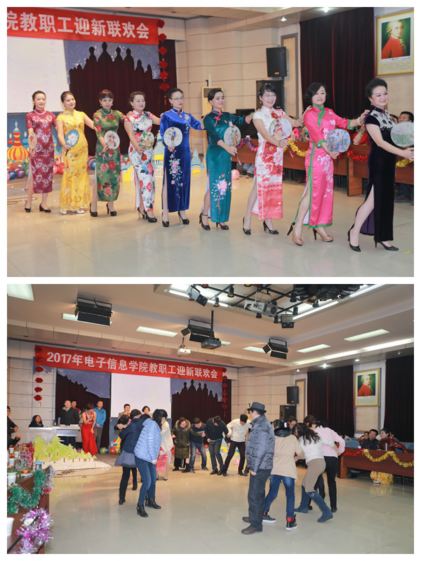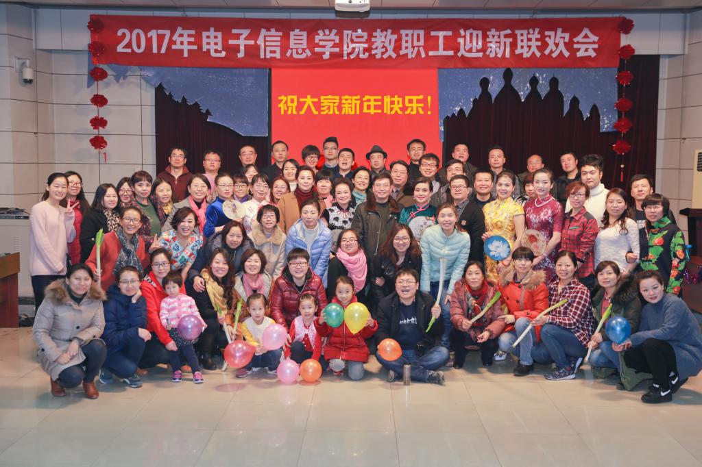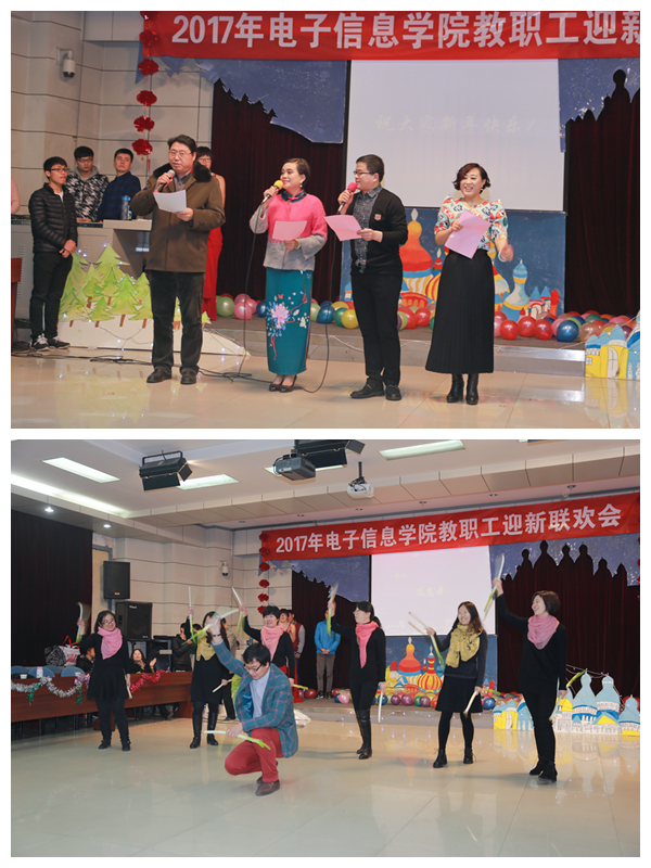 在2017新年到来之际,为开展好新一年教育教学各项工作,不断总结经验,开拓创新,同时为丰富学院教职工的校园文化生活,充分展示大家的艺术风采,体现电子信息学院大家庭“朝气蓬勃、团结一致”的精神风貌,1月5号上午,电子信息学院在自强校区大电教举行了2017年教职工迎新联欢会。学院副院长翁谦锁、工会副主席同颖葵、就业指导中心主任夏良武、督导室主任史艺红、思政教科部主任景延鹏、继续教育学院院长司西平、副院长许晓华、自强校区管理办公室副主任马建萍以及电子信息学院全体教师参加了联欢会。
