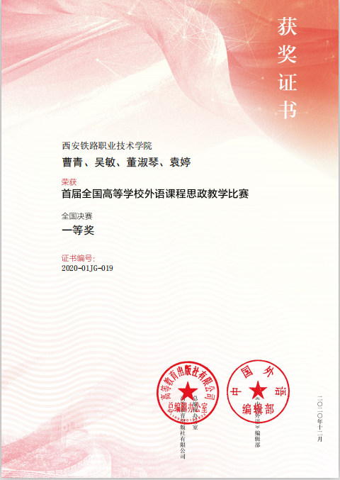 12月19-20日,由高等教育出版社与《中国外语》编辑部共同主办的首届全国高等学校外语课程思政教学比赛决赛在京举行。鸭脖基础部英语教研室曹青、吴敏、董淑琴和袁婷组成的教学团队荣获本次比赛全国总决赛高职高专英语组一等奖。