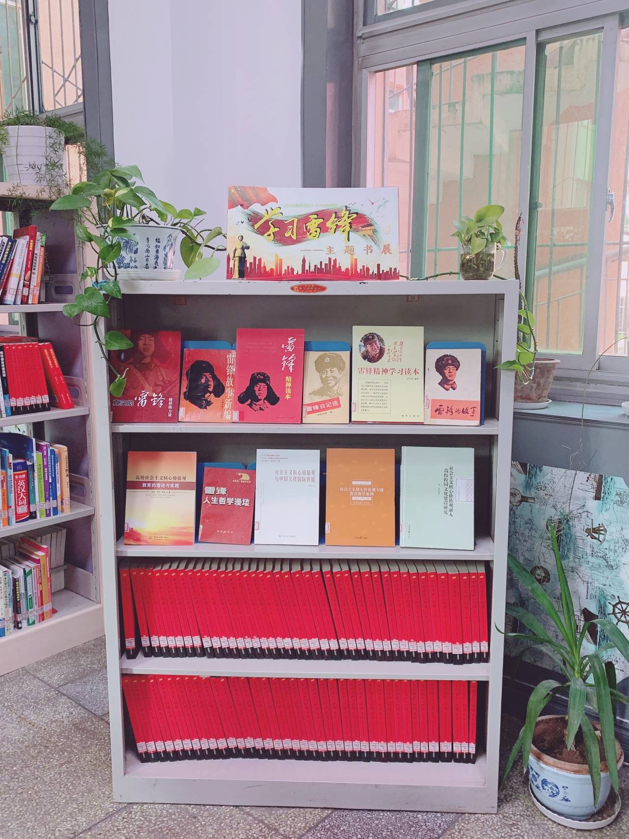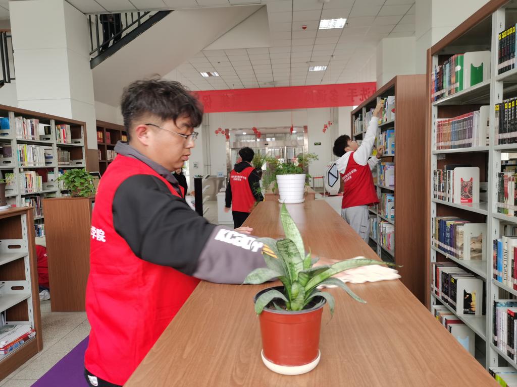 为大力弘扬雷锋精神,倡导时代新风貌,图书馆开展学雷锋志愿者活动。 港务校区,二十名身穿红色马夹的志愿者协助老师为读者服务。他们有的认真清扫环境卫生,有的埋头整理书架,有的专心修补污损破旧图书,有的热情为借还图书、打印复印和查找文献资料的同学提供帮助。志愿者的辛苦付出,为读者营造了一个整洁舒适的阅读环境。自强校区通过主题书展、图片展、主题影展等系列活动,弘扬雷锋精神,让读者重温雷锋的先进事迹,接受雷锋精神的洗礼。同时还组织志愿者们清理图书馆内白色垃圾、清扫卫生死角、擦拭门窗等活动,共同创建良好的校园环境。