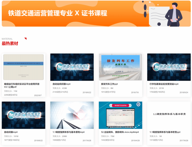 提供车站值班员等6个岗位“国家职业标准”“铁路特有工种技能培训规范”。建成《车站值班员》等4门职业技能等级培训课程。提供12000条职业技能鉴定考试题目。
