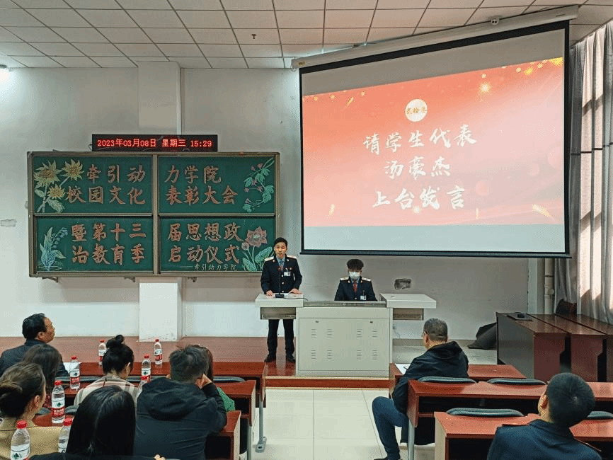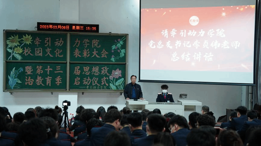 学习新思想,做好接班人,思想政治教育是历届高校素质教育的重要组成元素,为了能够有效的推进高校思想政治教育守正创新,3月8日牵引动力学院在105阶梯教室举办了“校园文化活动表彰大会暨第十三届思想政治教育季启动仪式”。总结回顾2022年学生思想政治教育工作,并对2023年重点工作进行安排部署。牵引动力学院党总支书记李贞伟、学工办主任陈广勇、组织委员王燕萍、各年级辅导员、班主任及学生代表约120余人参加会议,大会由辅导员牛鑫强主持。