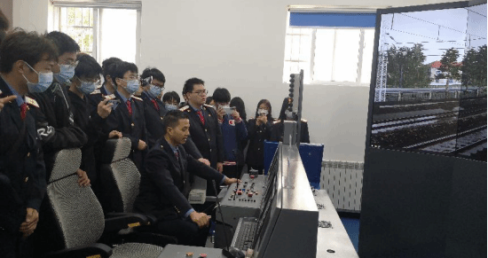 在09-32捣固车仿真作业实训室,工作人员细致讲解捣固车的应用现状和作业规程,具体演示捣固车的驾驶位、作业位操作流程,并指导部分同学亲身体验捣固车的驾驶和作业基础操作环节。