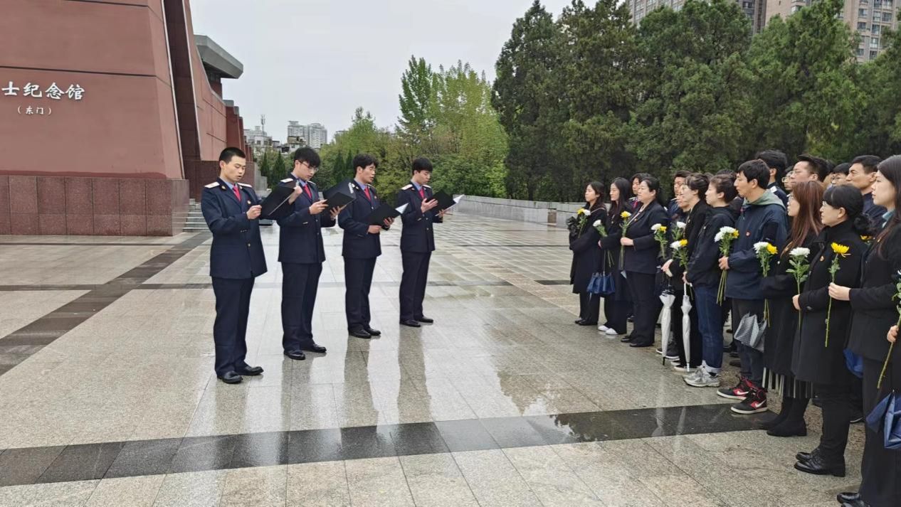 在烈士墓碑下,马克思主义学院全体党员在支部书记赵建英的带领下面对党旗坚定举起右拳,庄重宣誓“我志愿加入中国共产党,拥护党的纲领,遵守党的章程,履行党员义务……”铿锵有力的誓词响彻云霄,回荡在陵园青松柏翠之间,见证着思政课教师们对使命的忠诚与担当。