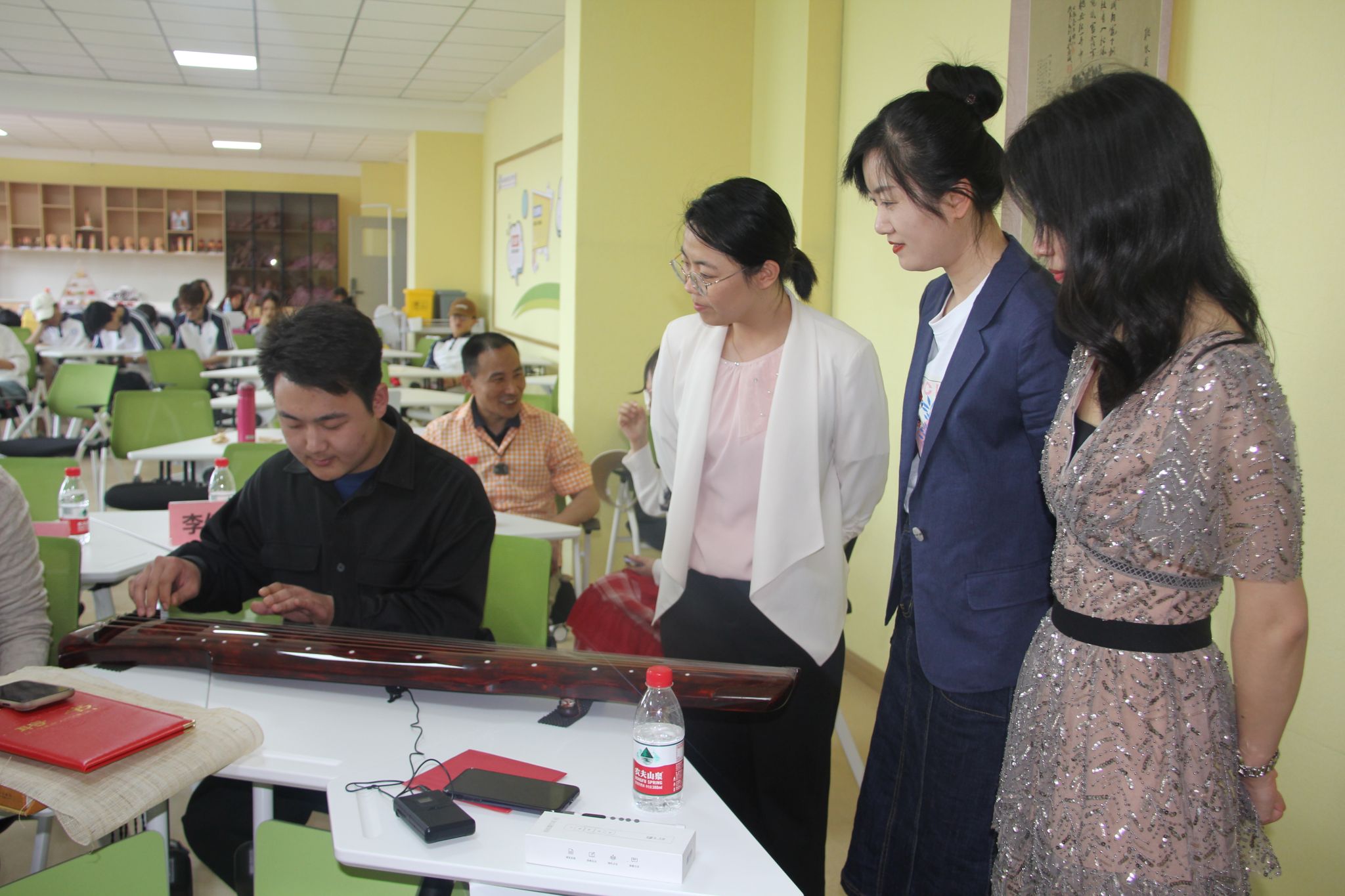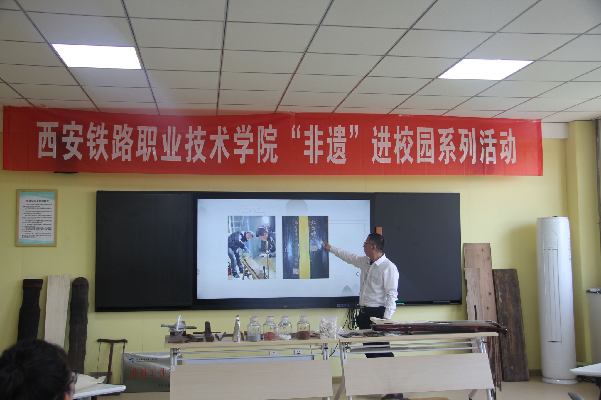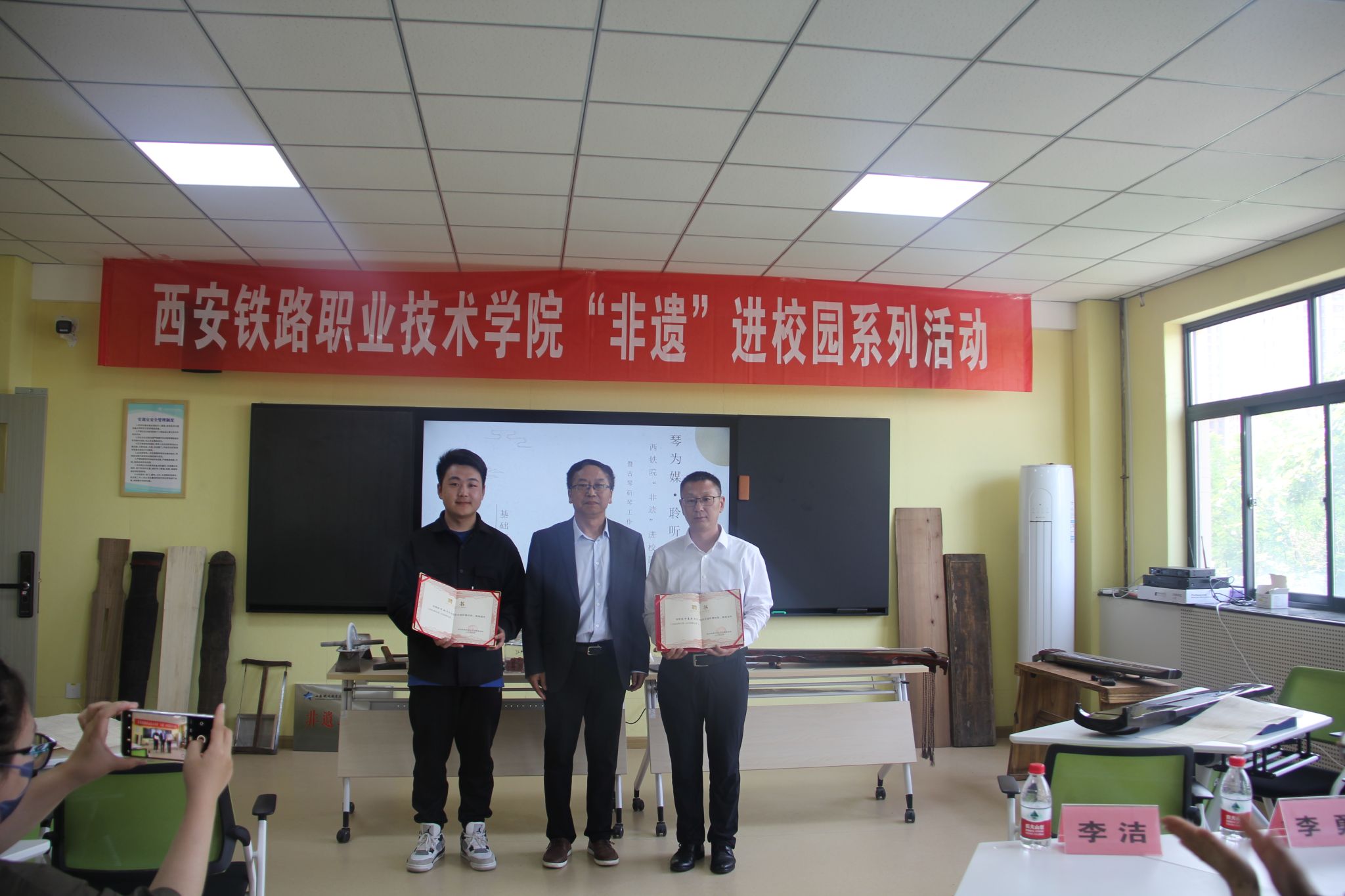 为弘扬中华民族优秀传统文化,增强保护文化遗产的自觉性,营造全社会关注、挖掘、保护和传承文化遗产的良好氛围,5月24日下午,由学院基础部学前教育教研室主办的“非物质文化遗产传承进校园”系列活动在龙首校区开展。基础部主任孙明魁、副主任张博雅、自强管理处副处长李勇、龙首校区综合办主任李洁及学前教育专业全体专任教师参加此次非遗讲座活动。同时,莅临本次活动的专家还有雁塔区古琴协会副会长许春光、弘琴杯古琴演奏银奖获得者许航、碑林区文化馆干事刘晓彤、李佳仪。