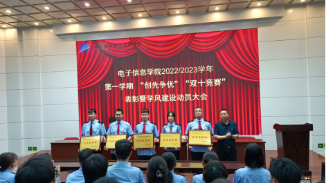 冯国良宣读电子信息学院2022-2023学年第一学期“创先争优”“双十学习竞赛”表彰决定,及优秀班集体、国家励志奖学金、三好学生、优秀学生干部、年级学习标兵、班级学习标兵等获奖名单。