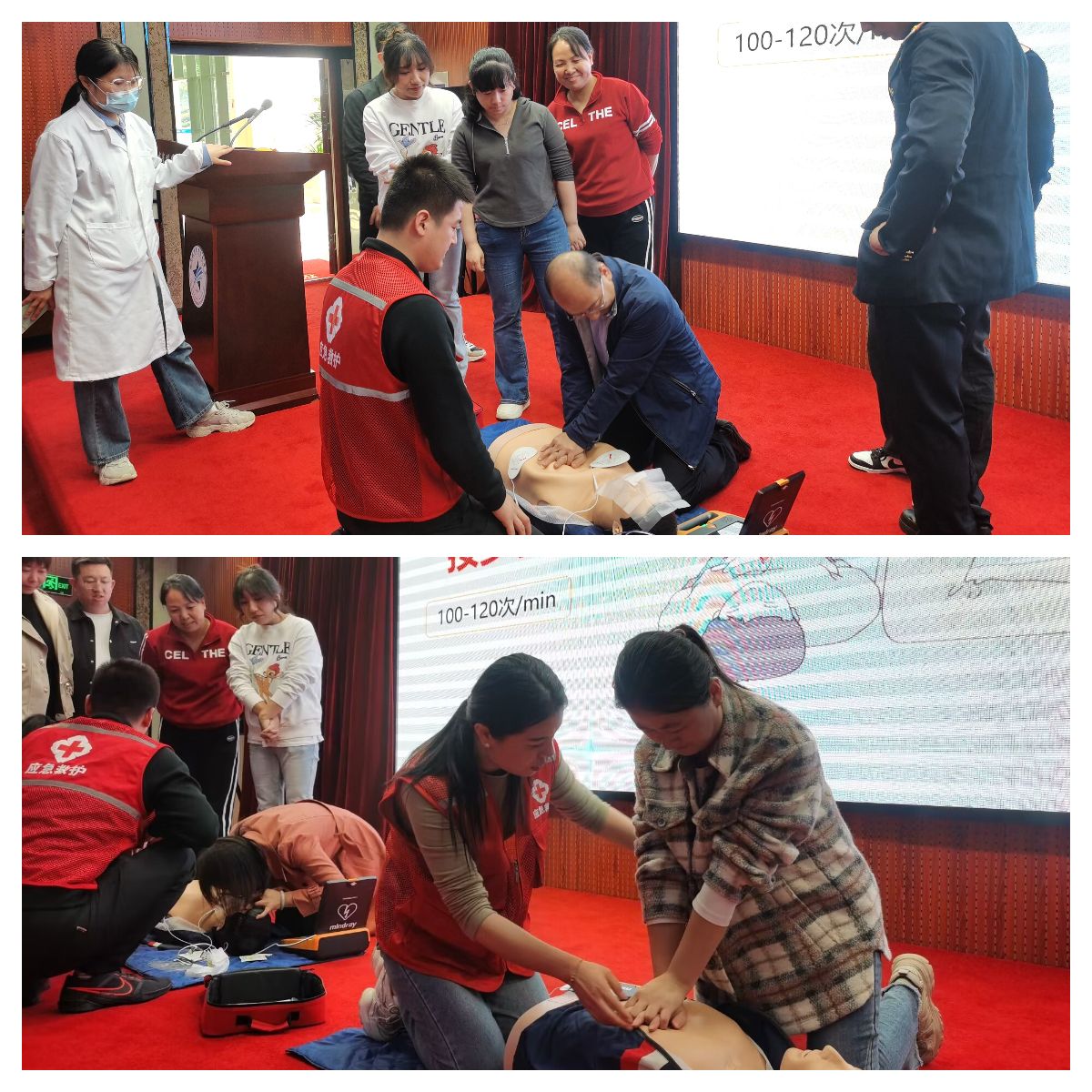 培训师流利的专业术语,精准的力度把握,让现场的师生受益匪浅。活动现场气氛活跃,学习热情高涨。互动环节中,在两位培训师手把手的耐心指导下,师生们亲身体验、动手练习,进一步掌握了心肺复苏等急救技能的正确方法和要领。