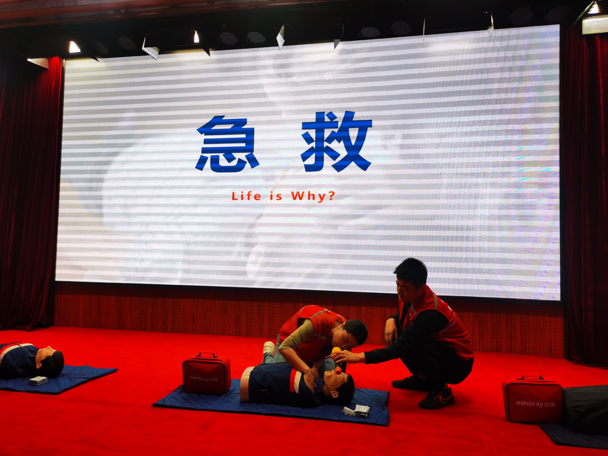 通过“理论+演练”的形式,陕西省红十字会救护员思雷以及迈瑞公司的救护培训师李天杰,通过理论讲解、视频教学、示范操作等环节,生动形象、通俗易懂地为师生介绍了现场救护概念、心肺复苏术、AED的使用、气道梗阻的现场急救等基本知识,并现场使用仿真模拟教具示范了急救操作的标准流程,如心肺复苏按压的时间要求、按压位置、操作步骤、人工呼吸技巧等,让在场师生亲身感受到黄金时间“4分钟”的重要性和紧迫性。李天杰强调:“时间就是生命!要以规范的步骤达到挽救生命、防止恶化、促进恢复的应急救护目的”。