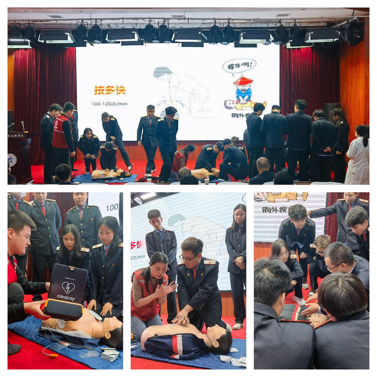 为进一步巩固和深化平安校园建设成果,增强广大师生应急救护意识和自救互救能力,10月10日下午,由党委学工部、后勤基建处主办的急救知识进校园活动在办公楼101报告厅举行,本次活动特邀深圳迈瑞医疗团队资深代表为港务校区的师生进行培训演练,学院副院长熊奇,党委学生工作部部长李栋、后勤基建处处长任卫东、副处长李永辉、各校区二级学院辅导员班主任及学生代表200余人参加活动,活动由党委学生工作部副部长孟永辉主持。