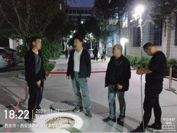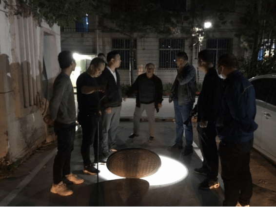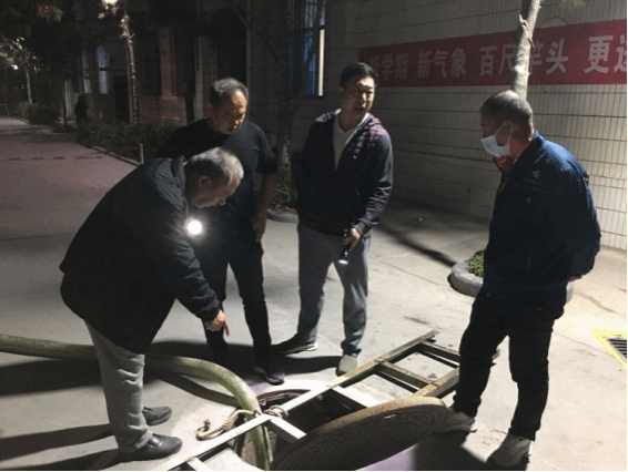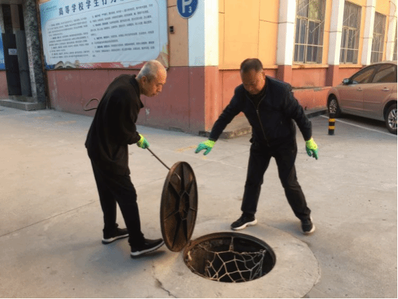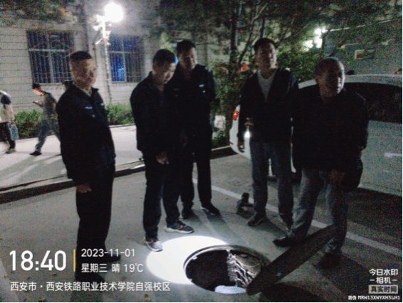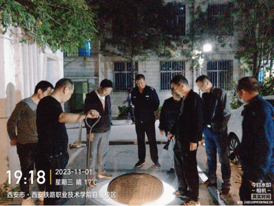 组织总务科水、电值班人员对综合管沟积水区域、学生三公寓北侧广场区域10余个下水井盖逐一打开进行排查,反复查看管道走向、管网分布,研判积水原因,确定淤积、堵塞点。