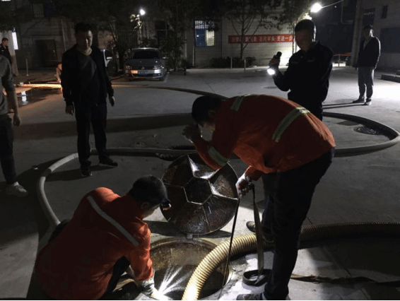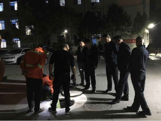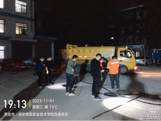 联系、调度清淤疏通车进校,一到现场马上投入清淤、疏通工作,现场调度、排水、接水带、照明、清淤、疏通、围挡、安全防护等各项工作有条不紊。