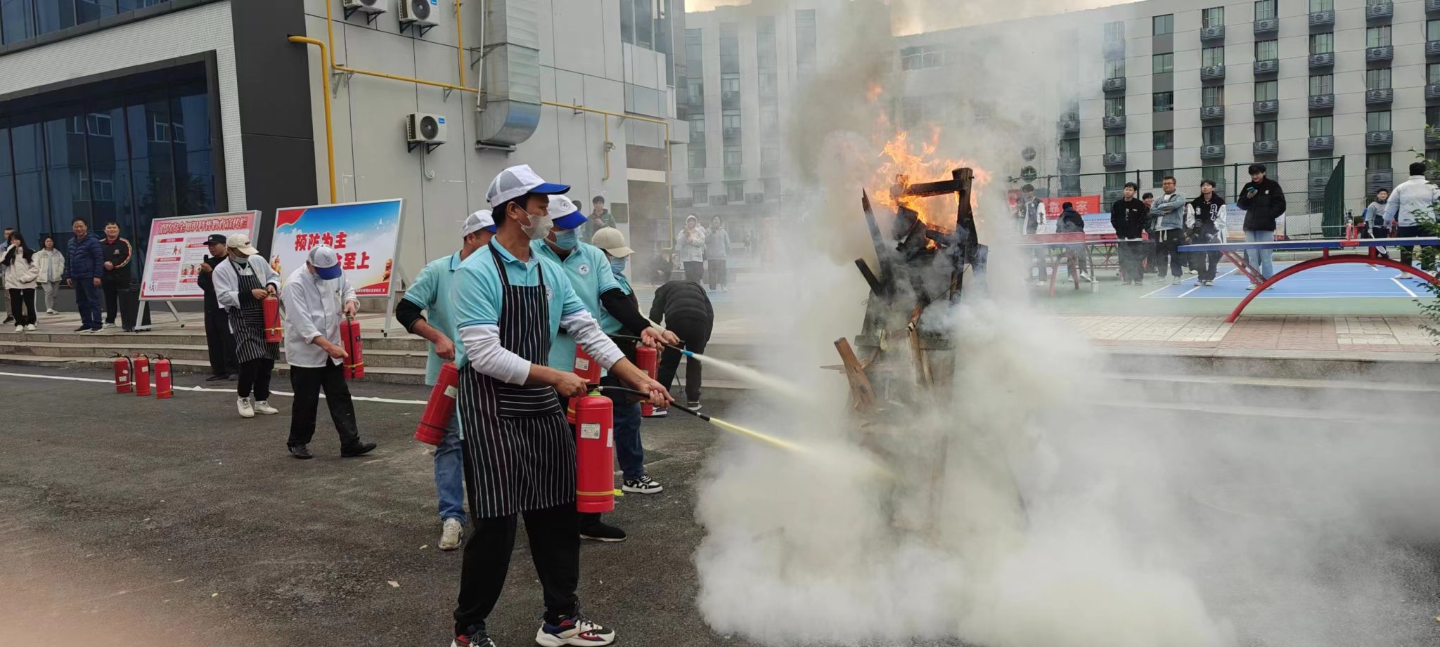 随后进行应急演练。活动现场模拟“起火”,师生员工在宋磊的指导下,逐一实践灭火器的使用方法,包括拔保险栓、对准火源根部规范喷洒等细节。