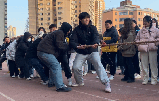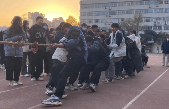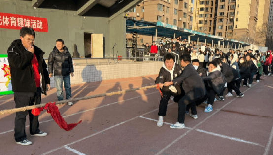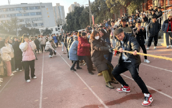 迎着冬日的暖阳,一场别开生面的师生拔河比赛开始了。由薛明主任组织的老师代表队和侯旭龙老师组织的学生代表队站列两旁,队员们个个鼓足了干劲,倾全力于一身,集合力于一绳,齐力奋战,以热情、积极的精神投入到比赛活动中。参赛选手咬紧牙关,拼尽全力顽强拼搏,赛场外,拉拉队的加油声此起彼伏,彼此之间的呐喊声在校园内回荡,响彻云霄。