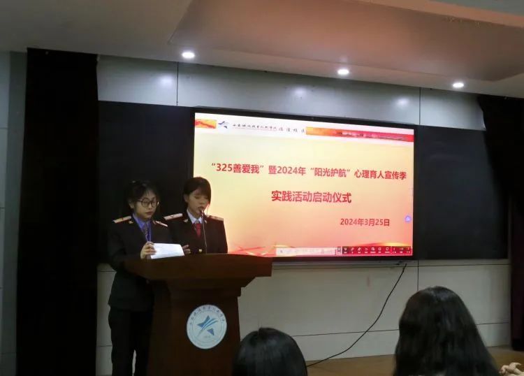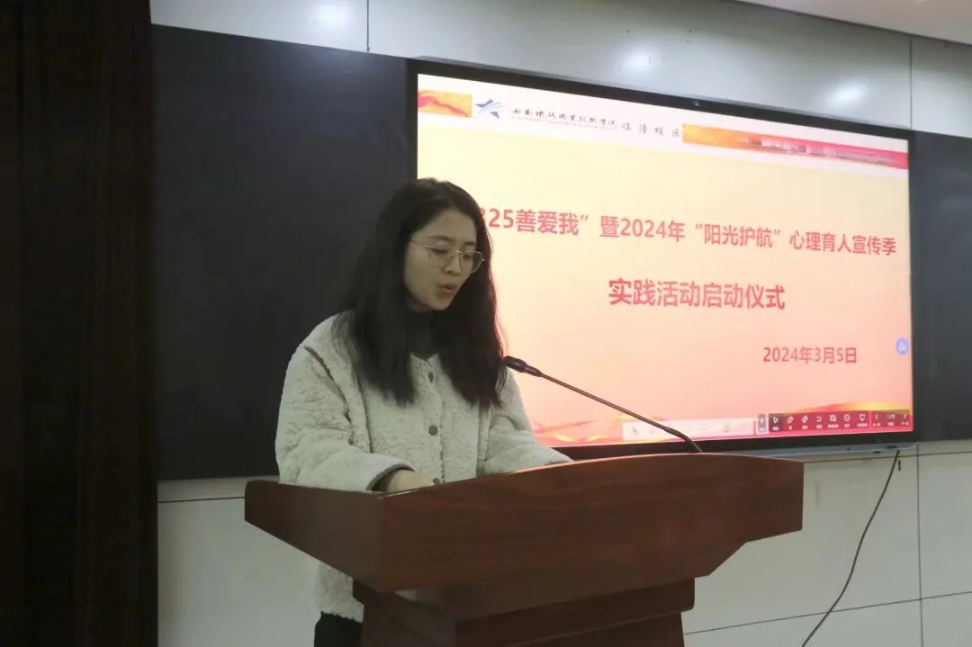 启动仪式上,校区心理教师雷涵尹宣读了学院《2024年“阳光护航”心理育人宣传季系列活动实施方案》。本次活动以“惜青春韶华,赴‘心’辰大海”为主题,时间从3月份持续到6月份,倡导同学们在心理育人宣传季的系列活动中积极参与、用心体验,努力培养自尊、自信、自爱、自强的心理品质。