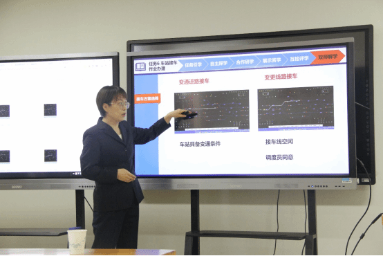王秀丽表示,课堂内容需关注热点问题,体现特色、亮点,秉持“人无我有,人有我优”创新精神,既要将课讲得有趣,又要将课讲得清楚,不忘讲课初心和本质。交通运输学院副院长刘新强表示,教学内容应与选题密切贴合,专业特色应与行业特点相结合,渗透“现代化服务”新理念,将服务货运、服务客运的行业准则贯穿铁路人才培养全过程,同时,比赛内容设计应对标国赛标准,不局限于传统授课模式,应突出创新点。