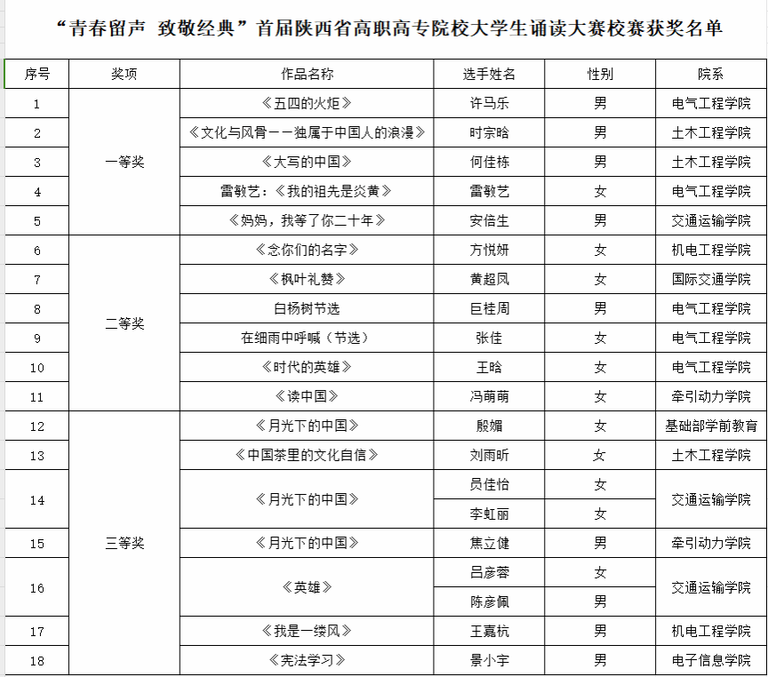 5月14日,图书馆联合学工部组织院团委、交通运输学院、土木工程学院共11名评委严格按照普通话、诵读内容、技巧、作品表达等四项大赛评分标准对所有参赛作品逐一试听,认真评选,共有18位同学获奖。其中,安倍生的《妈妈,我等了你二十年》、许马乐的《五四的火炬》等5位同学作品获一等奖,方悦妍的《念你们的名字》、黄超凤的《枫叶礼赞》等6位同学作品获二等奖、殷媚的《月光下的中国》、刘雨昕的《中国茶里的文化自信》等7位同学作品获三等奖(见下表)。