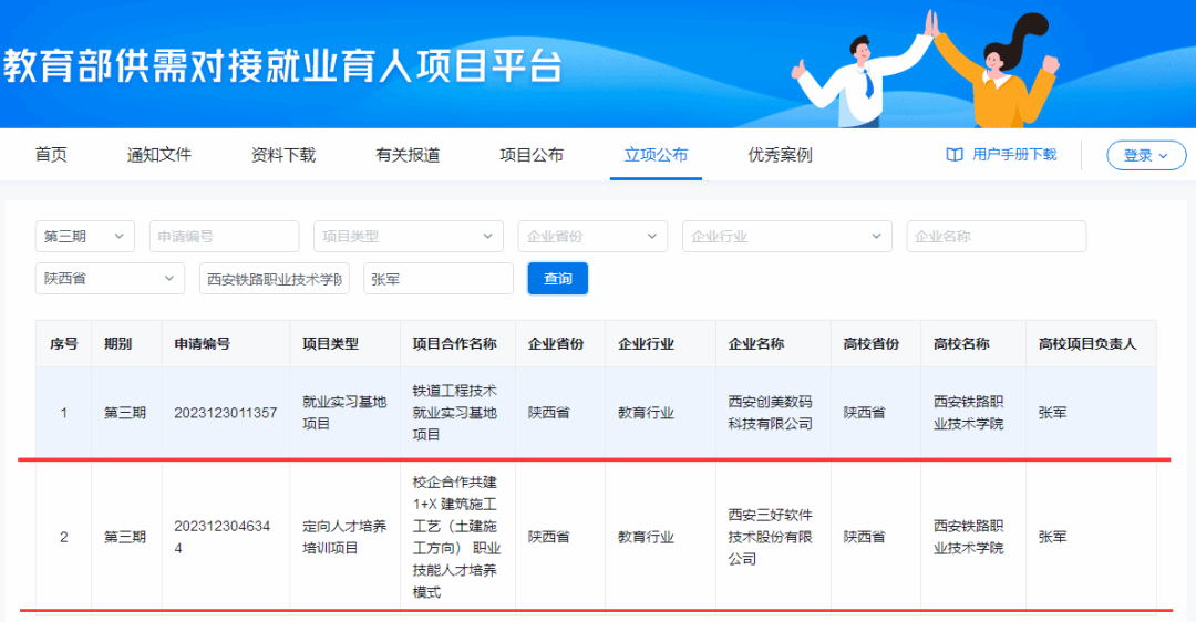 6月14日,全国普通高校毕业生就业创业指导委员会和教育部高校学生司(高校毕业生就业服务司)下发《关于公布教育部第三期供需对接就业育人项目立项名单的通知》(教就业司函〔2024〕23号),临潼校区与陕西创美数码科技有限公司联合申报的“铁道工程技术就业实习基地项目”、与西安三好软件技术股份有限公司联合申报的“校企合作共建1+X建筑施工工艺(土建施工方向)职业技能人才培养模式”2个就业育人项目获批立项。
