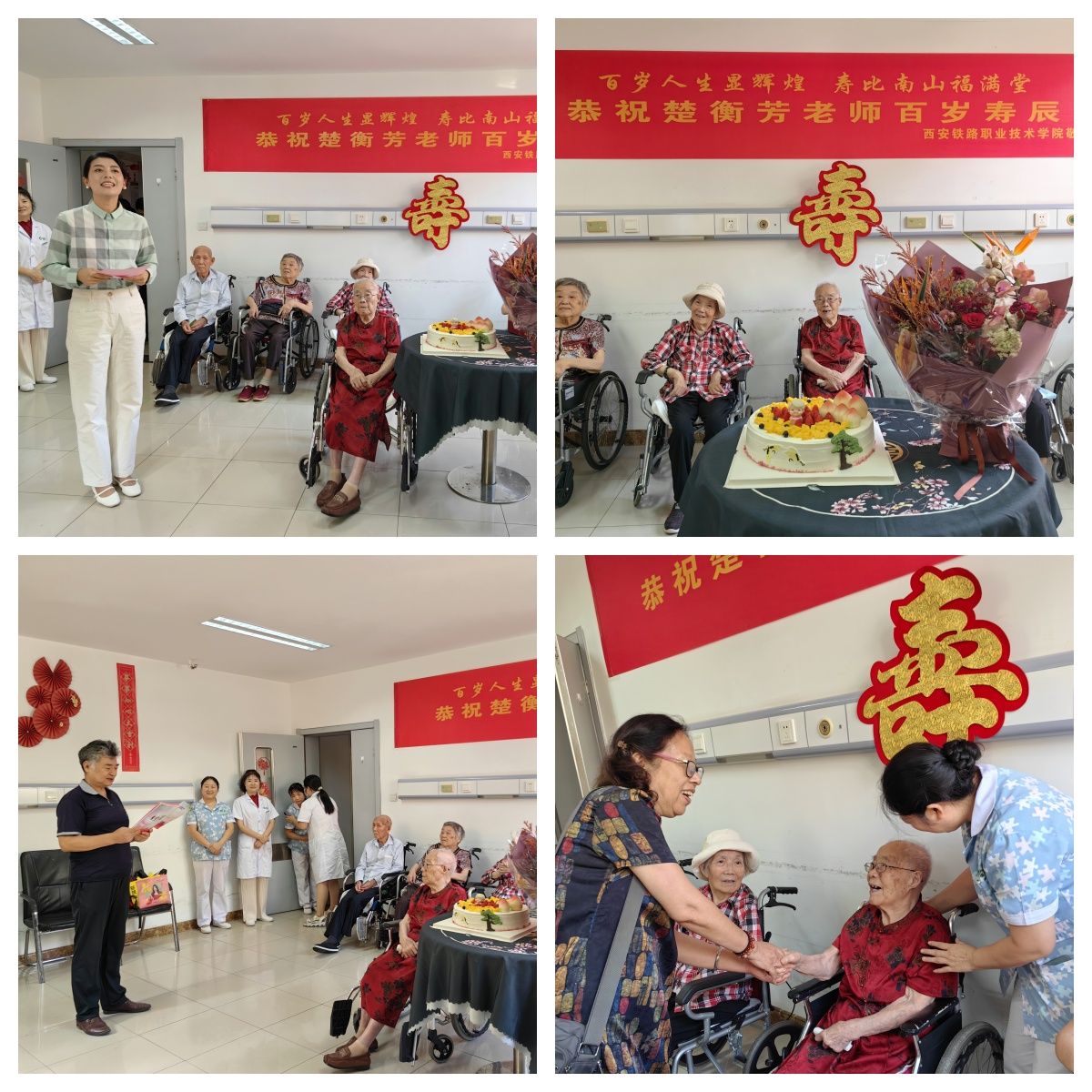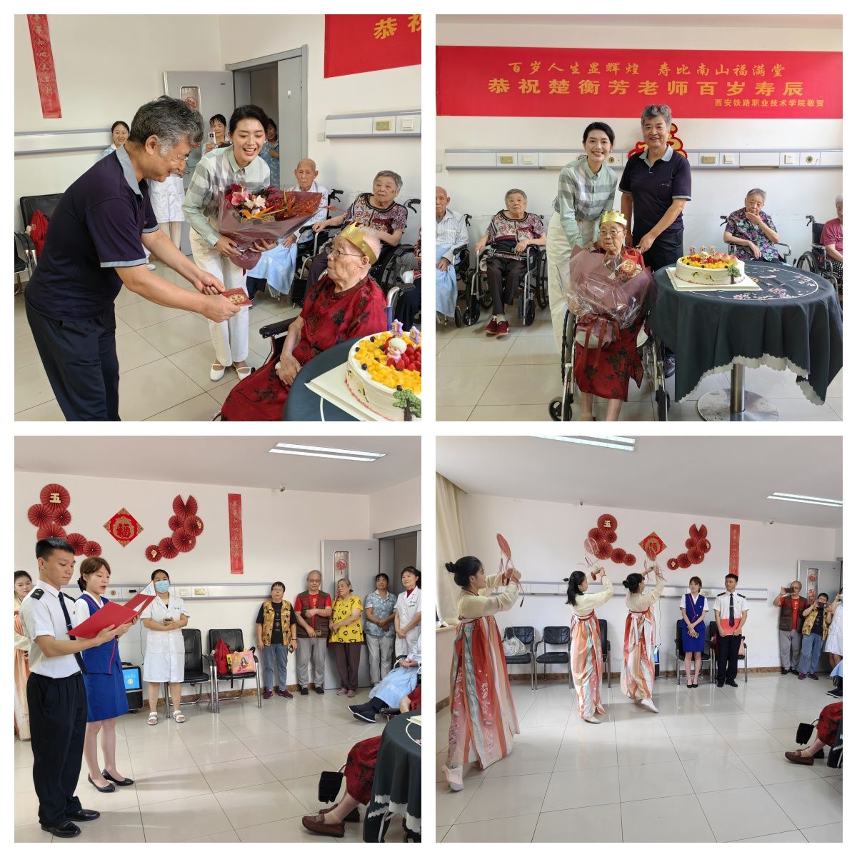 祝寿仪式由朱叶主持,首先,马生海代表市退教协会致辞,祝愿百岁老人生日快乐、健康长寿,并送上慰问金。随后,朱叶代表学院为楚衡芳送上最诚挚的祝福,楚衡芳家属也代表家人致感谢词。工作人员为老人送上鲜花、生日蛋糕,并齐唱生日歌,祝福她福如东海、寿比南山。最后,鸭脖学生表演了诗朗诵《歌颂恩师》和舞蹈《醉叹盛世》。