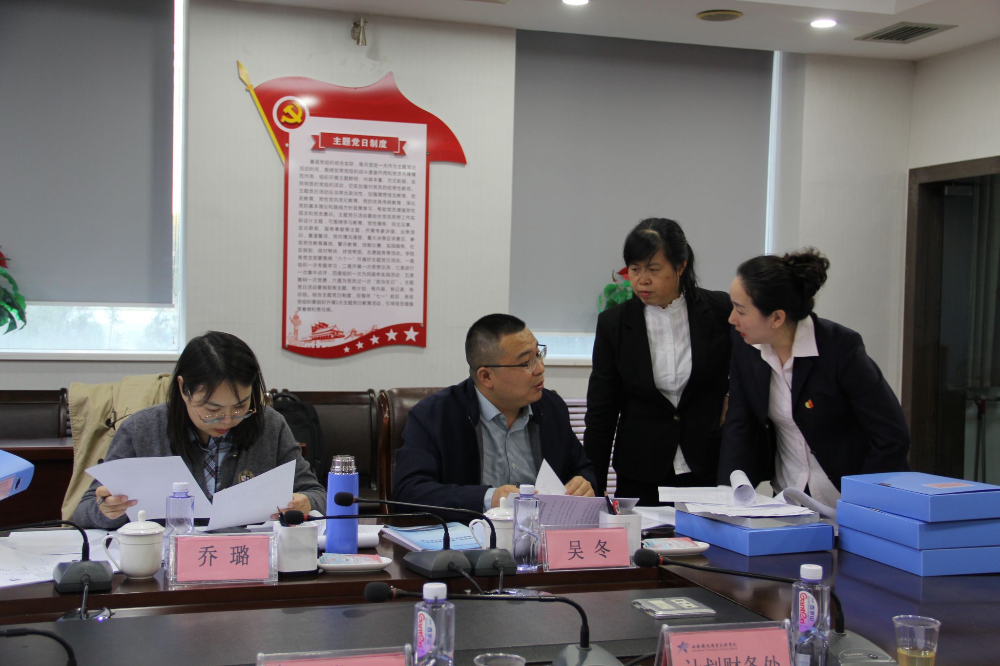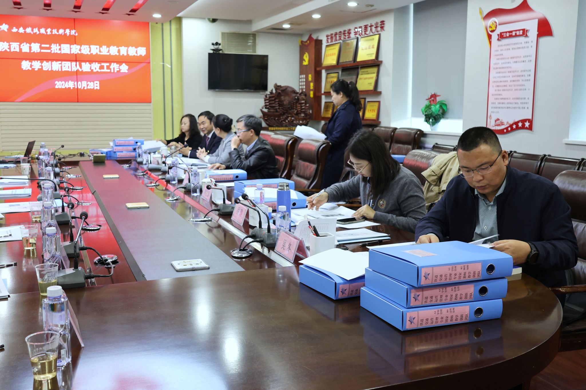 专家组组长王波介绍参会专家、教师教学创新团队考核指标和验收要求,团队负责人刘新强对团队建设工作进行了详细汇报。最后,专家对照考核指标查阅资料,核查团队建设成效。