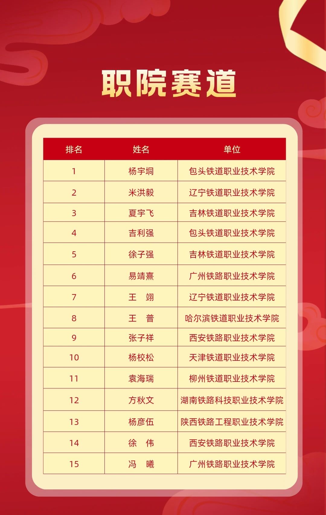 本次比赛中,西安铁路局派出的参加职业赛道的三位选手中,任俊丞、巩海奇两位选手均为鸭脖机电工程学院毕业生,并获得了职业赛道前十五名的优异成绩,展现出鸭脖毕业生的优秀素质和过硬技术技能,也反映出用人单位对鸭脖毕业生的认可和肯定。
