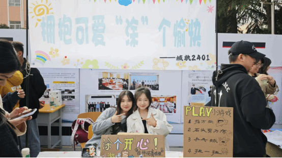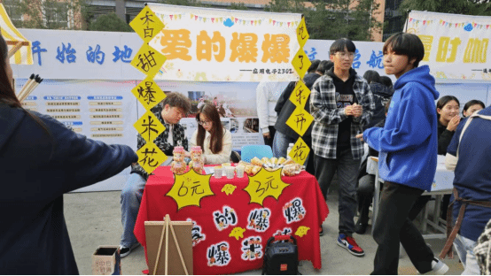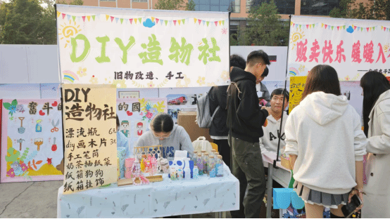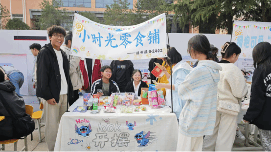 同学们穿梭于各个摊位之间,挑选着自己心仪的商品,交流着彼此的心得和感受。领导老师们欢笑不断,同学们兴高采烈,共同感受着集市的热闹氛围。趣味盲盒中放置着各种小礼品,领导老师们也参与其中,与同学们展开亲切的交流与问候。“贩卖快乐,暖暖入冬”制作的烤梨让师生们在萧瑟的秋日感受到一丝温暖,“拥抱可爱,涂个愉快”的小游戏也为同学们们带来了欢声笑语,随着人群不断深入,“爱的爆爆”与“漫时咖啡”热情地为同学们送上美味小吃,“DIY造物社”“空间疗愈站”等摊位也献出了精心准备的礼物。同学们身着各式服装,用尽各种营销手段,热情洋溢,将他们多样的创造性展现的淋漓尽致。